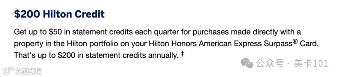 - 新增每年$200希尔顿酒店消费报销,分四个季度发放,每季度$50,通过官方渠道预订或入住即可触发报销资格[k]。