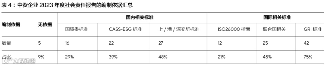 由于百大中资企业的2023年度社会责任报告均采用内容统一、语言不同的方式发布,所以本文在统计社会责任报告的编制依据时,以发布较为及时的国内中文版社会责任报告为准。如表4统计,2023年度百大中资企业在国内共发布了56份独立的社会责任报告,其中有5家企业的报告无编制依据或并未在报告中列示,也就是说,中资企业的社会责任报告存在缺少编制依据、缺乏统一标准的情况。