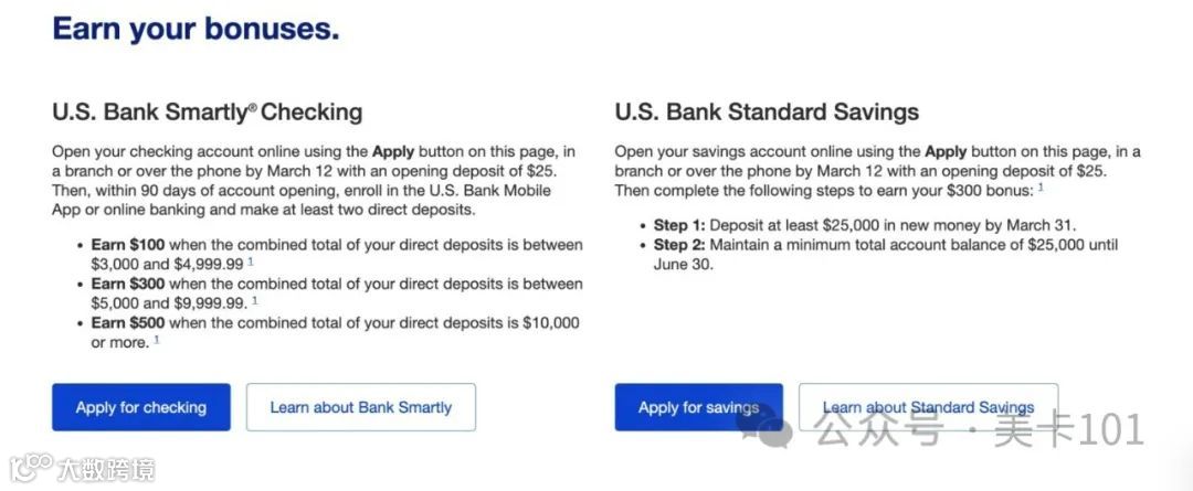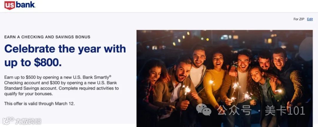 2024年1月更新:US Bank目前推出新开户优惠活动,开立支票账户(Checking)最高可获得$500奖励,再开立储蓄账户(Saving)最高可额外获得$300奖励。该活动将于2024年3月12日截止,部分奖励条件要求较高,适合有闲置资金并能完成直接存款(Direct Deposit)的用户参与[k]。