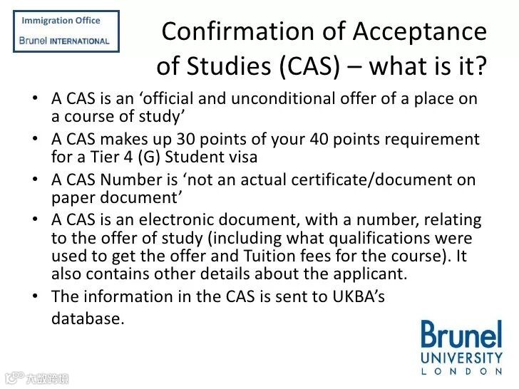 对于赴英国大学学习的学生,CAS即是英国大学电子录取通知书,是英国大学发给学生的一个特别的电子参考号码。