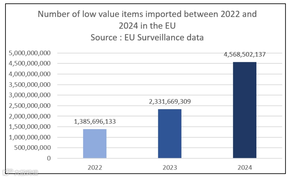 从2023年到2024年,欧盟进口的电子商务包裹数量翻了一倍。2024年,约有46亿件低价值货物(价值150欧元或以下)进入欧盟市场,每天达到1200万个左右。