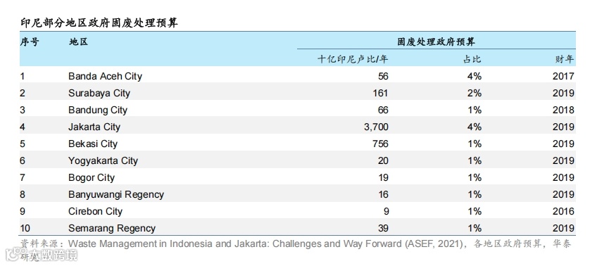 印尼垃圾处理资金主要依赖政府财政,未设立垃圾处理税费。固废支出来源于地方政府预算(APBD),2017-2019年期间,10个地区预算占比为1%~4%。其中雅加达达4%,高于同期北京(1.8%)、上海(1.7%)和新加坡(3.0%),显示其对固废治理的较强财政支持能力[5]。