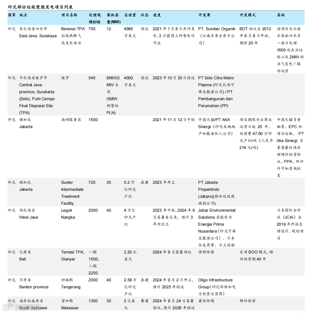 目前印尼多数垃圾焚烧项目处于中标或建设阶段,参与企业包括印尼本土、中国和日本公司。泗水Benowo项目为当前唯一已投运的代表性项目,处理规模750吨/日,总投资4986万美元,采用20年BOT模式。中国天楹2021年中标雅加达南部服务区项目,特许期25年,处理费约214元/吨。伟明环保签署巴厘岛Temesi项目BOO协议,特许期40年;2024年2月起,巴厘岛向国际游客征收约68元人民币旅游税,其中50%-70%将用于垃圾处理。Jabar Environmental Solutions(印尼与日本合资企业)2023年中标Legok Nangka项目,处理能力达2000吨/日[6]。