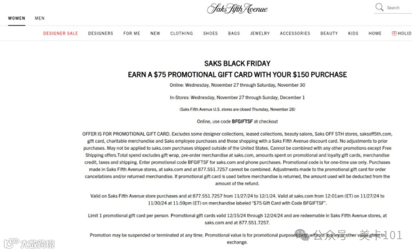 延续往年活动:消费满$150返$75礼品卡,适合搭配AMEX Platinum卡相关权益使用[k]。