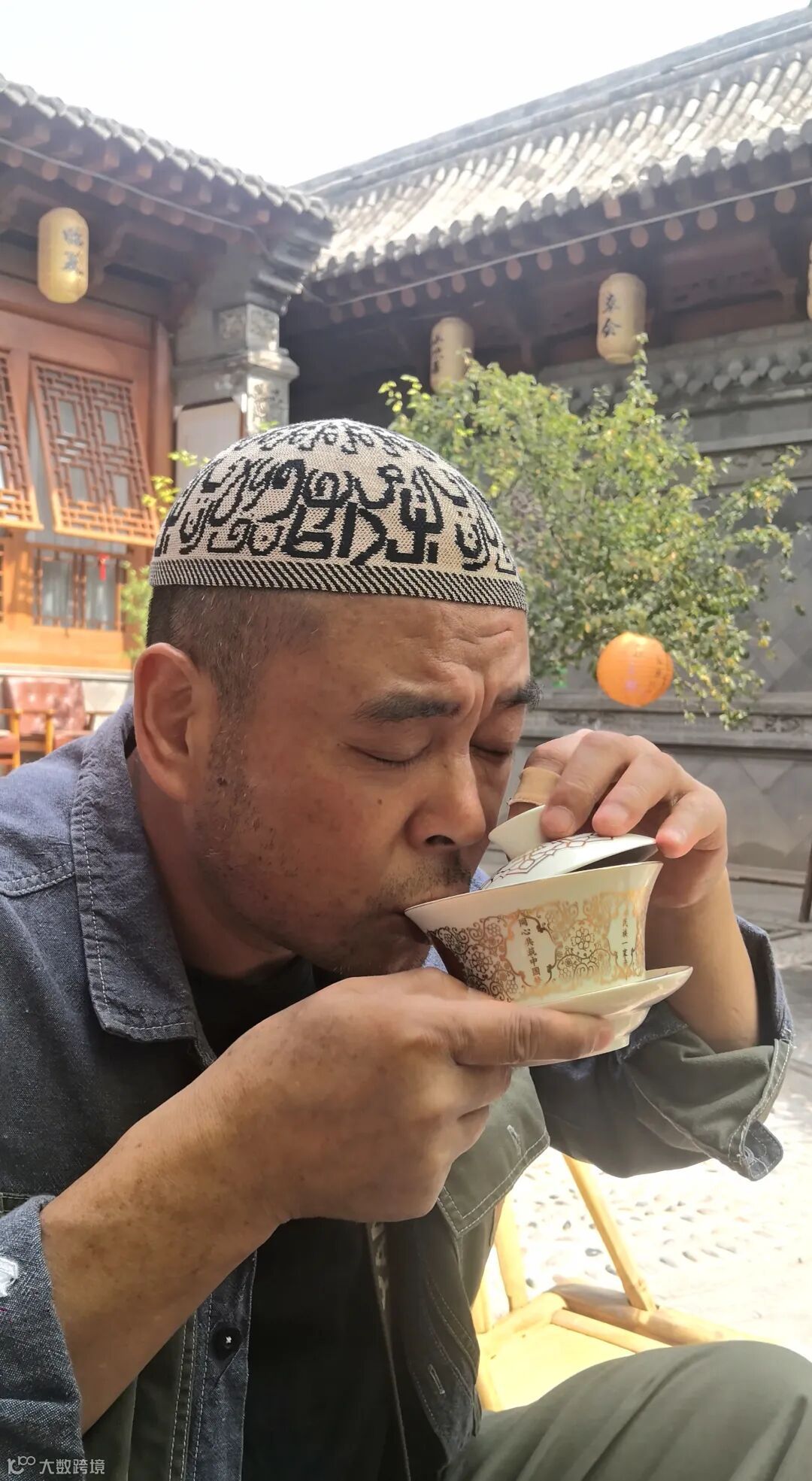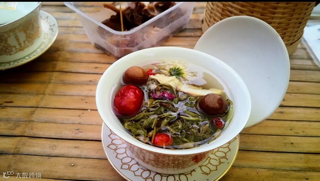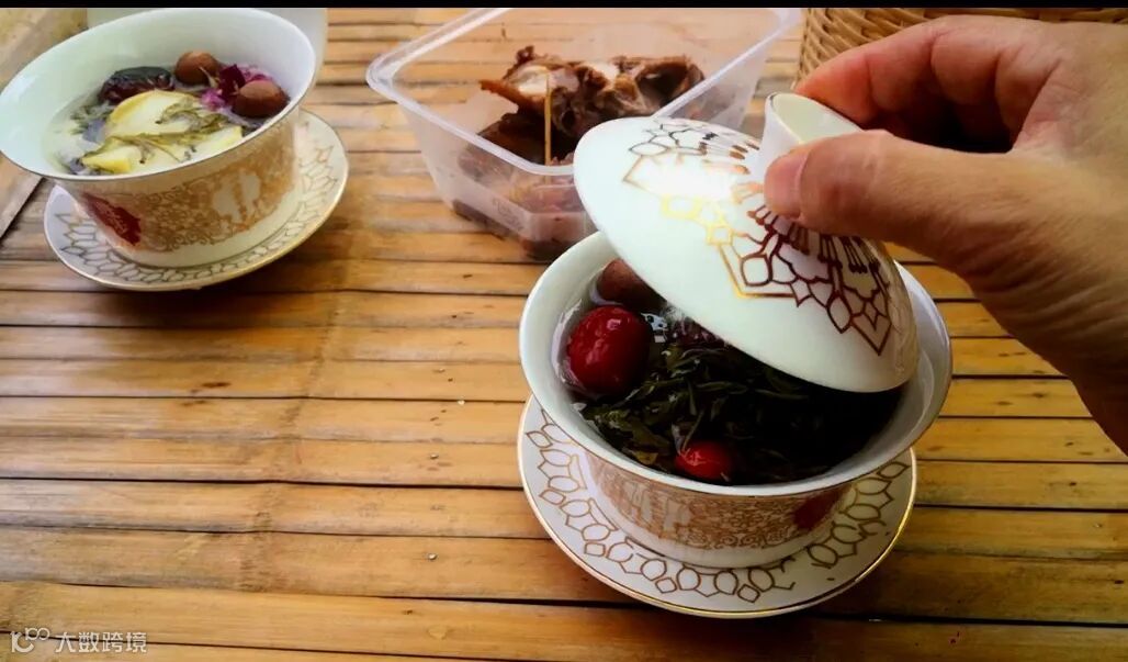 点了两杯他们本地人喝的盖碗茶:三炮台,他们称“刮碗子”。