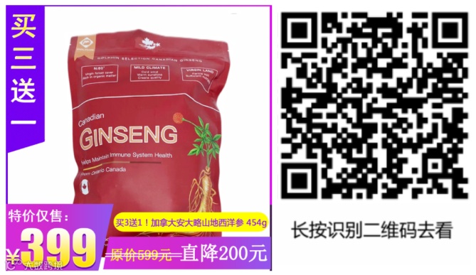 加拿大安省山地西洋参历史超低特价秒杀!立减200元,单袋仅399元!并且,还有买3袋即送1袋即时活动!(国内现货发 全国包邮)