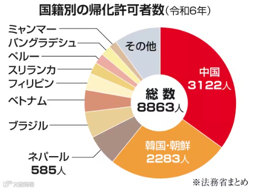 根据日本法务省最新统计,2024年全年共有8863名外国人获得日本国籍,即取得归化许可