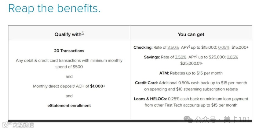 该支票账户在满足一定条件下可享受3.5% APY的高收益率,但优惠利率仅适用于前15,000美元资金。若希望更高金额享受高利率,可另行开设储蓄账户[k]。