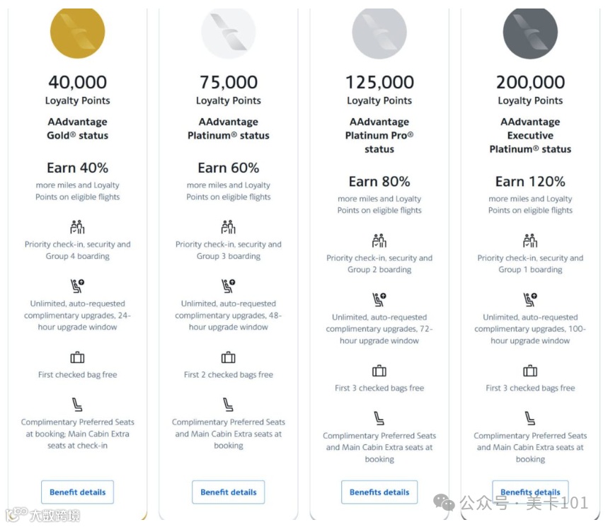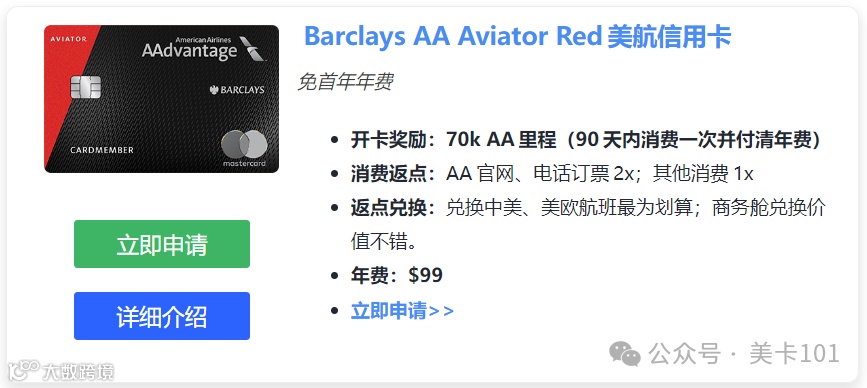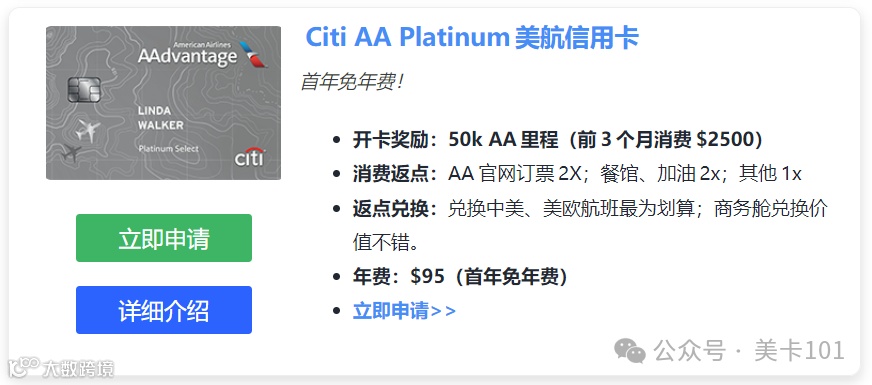 联名信用卡是获取AA里程的重要途径。AA信用卡由花旗银行(Citi)和巴克莱银行(Barclays)发行,入门级卡种开卡奖励优厚,建议优先申请以快速积累里程[k]。