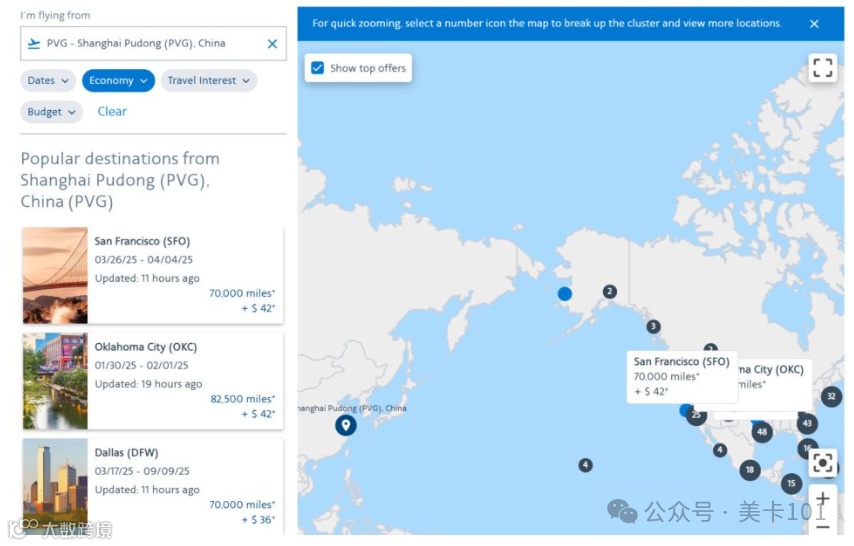 AA提供交互式里程地图工具,用户可输入出发城市,查看各目的地所需最低里程,并直接跳转至订票页面[k]。