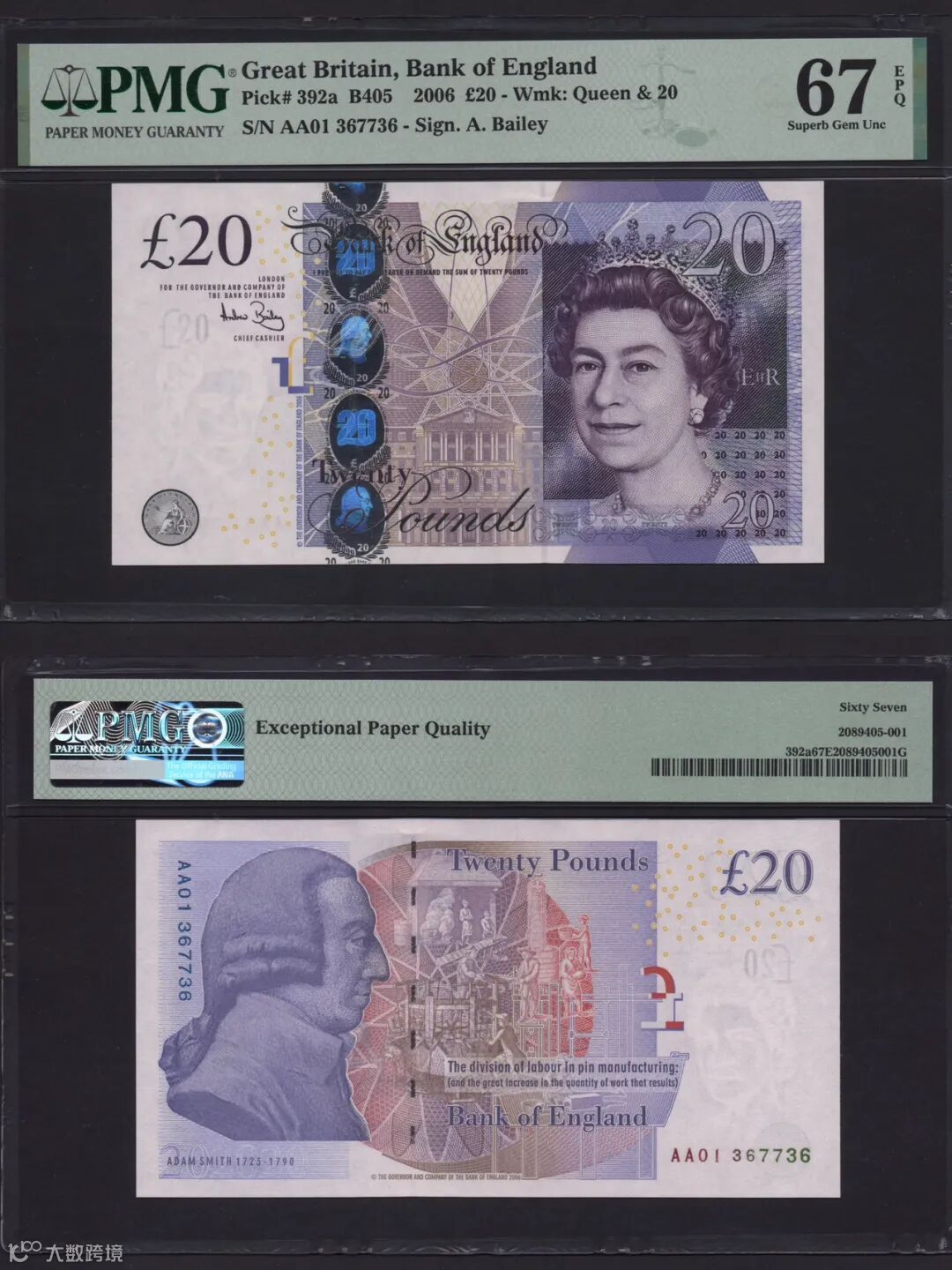 F序列纸币包括20英镑和50英镑,该系列纸币未设计5英镑和10英镑。这版纸币中的第一张是20英镑纸币,纸币上印有苏格兰经济学家亚当·斯密的肖像,他是第一位出现在英格兰银行纸币上的苏格兰人(第一位非英格兰人是英裔爱尔兰陆军元帅,威灵顿公爵亚瑟·韦尔斯利)。斯密的肖像也出现在苏格兰克莱德斯代尔银行发行的50镑纸币上。