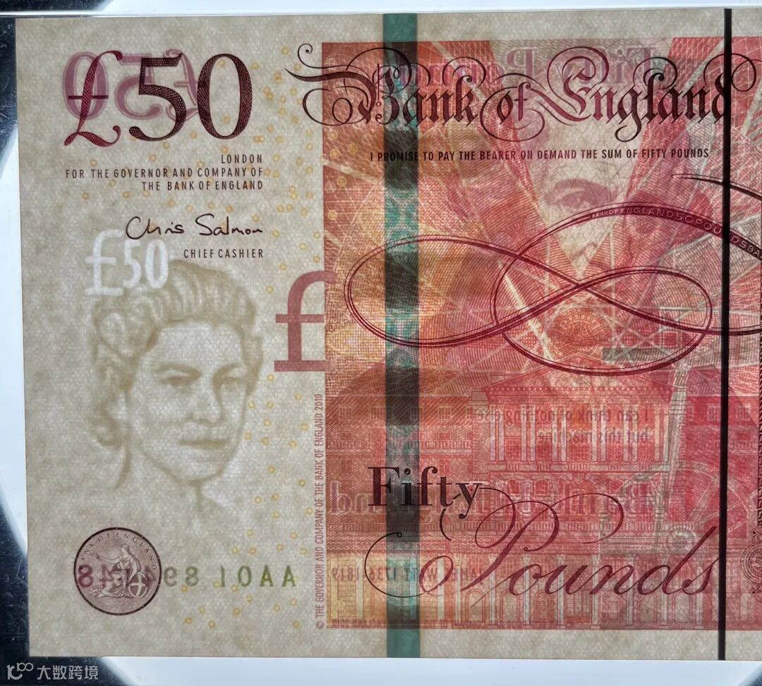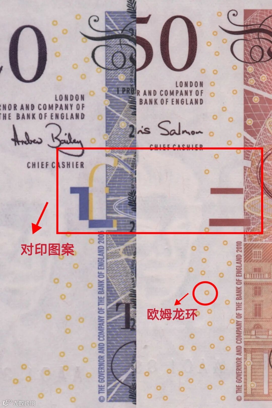防伪措施:伊丽莎白二世女王头像固定水印、数字50和£白水印、motion动态安全线、欧姆龙环、“£”对印图案