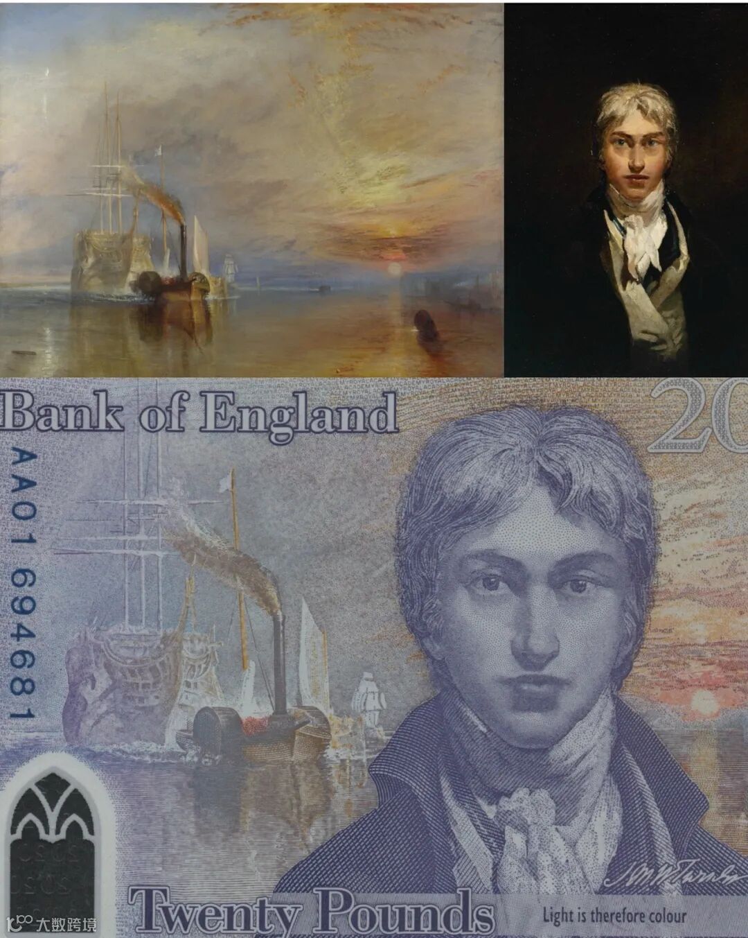 背面:英语面值数字、威廉·特纳自画像、“战斗中的特莱梅尔”油画、威廉·特纳亲笔签名影印版