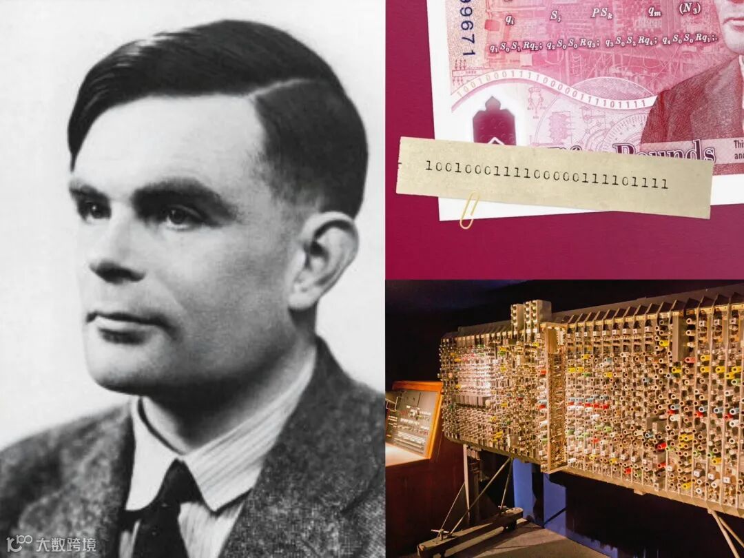 阿兰·图灵与自动计算机器(ACE)、右上角图片为“二进制”号码组成的阿兰·图灵的生日(1912年6月23日)