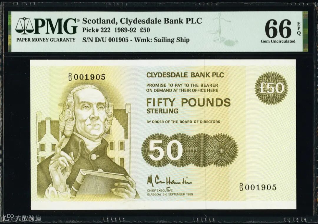 苏格兰克莱德斯代尔银行发行的50镑纸币(正面为亚当·斯密肖像)