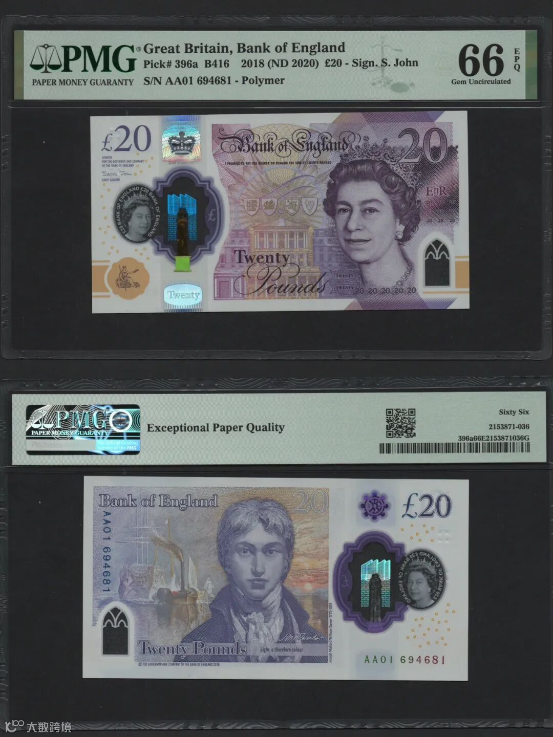 1、最后一版纸质女王头像英镑与第一版塑料钞版女王头像英镑。