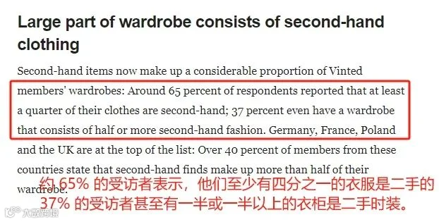 这股风潮不仅限于法国。德国、波兰、英国等欧洲市场同样迎来二手消费高峰。Vinted报告显示,近65%的欧洲受访者衣橱中超过四分之一衣物为二手,超37%的人一半衣物来自二手市场。消费者更倾向购买高质量、耐穿的单品,而非廉价快时尚[k]