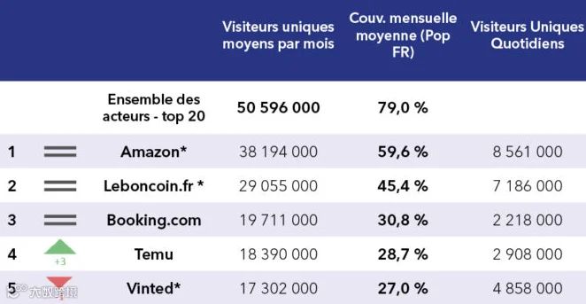 在法国,Vinted已成为主流电商平台。Kantar研究显示,亚马逊、Vinted和Zalando是法国消费者最常用的三大平台,均位居在线销售额前列。2024年第二、三季度,Vinted月独立访客数分别达1706万和1730万,位列第四与第五[k]