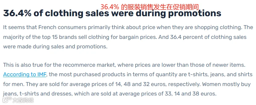 价格是法国消费者选购服装的核心考量。调查显示,排名前15的品牌中,多数以优惠价格销售,36.4%的服装交易在促销期间完成[k]