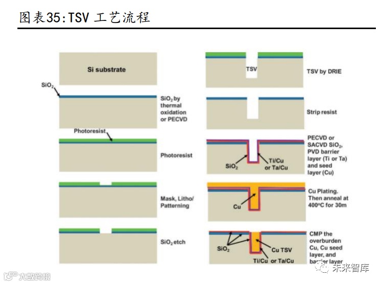 TSV工艺流程包括深硅刻蚀、绝缘/阻挡/种子层沉积、深孔填充、退火、CMP减薄及Pad制备等环节[[k]]。