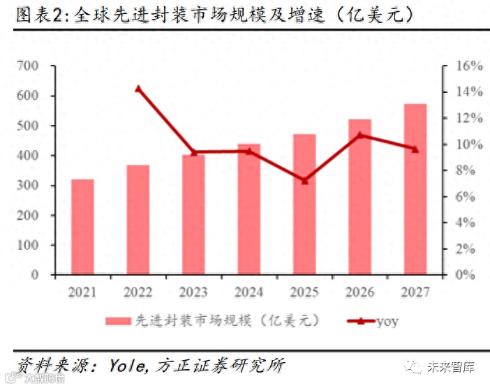 先进封装市场规模稳步增长,预计从2021年的321亿美元增至2027年的572亿美元,年均复合增长率达10.11%。2022年全球先进封装占比为47.2%,预计2025年接近50%;中国市场占比为38%,虽低于全球水平,但差距逐步收窄[[k]]。