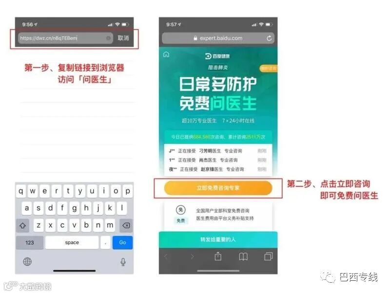 近日,国内多家医疗健康咨询服务平台开通免费在线诊疗咨询、防疫知识科普及心理疏导等服务,着眼保障海外中国公民健康和安全,解决部分海外侨胞语言不通、获得当地医疗咨询服务难等问题。驻巴西使馆梳理了部分平台资源,供旅巴侨胞查阅参考(排名不分先后),具体内容如下: