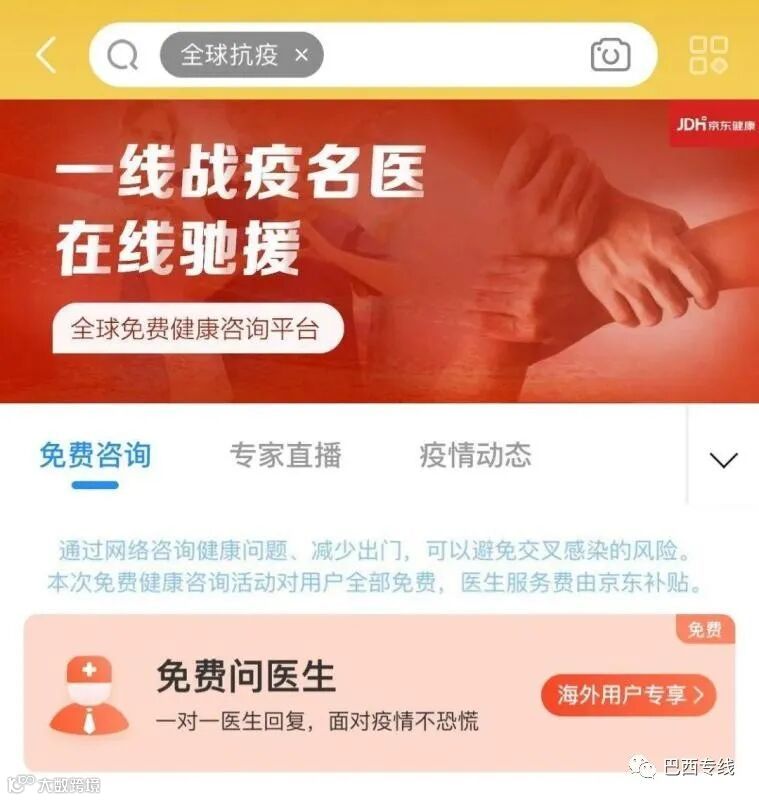 打开京东APP,在搜索框搜索“海外问诊”或“全球抗疫”即可进入活动页面。该平台提供的服务包括: