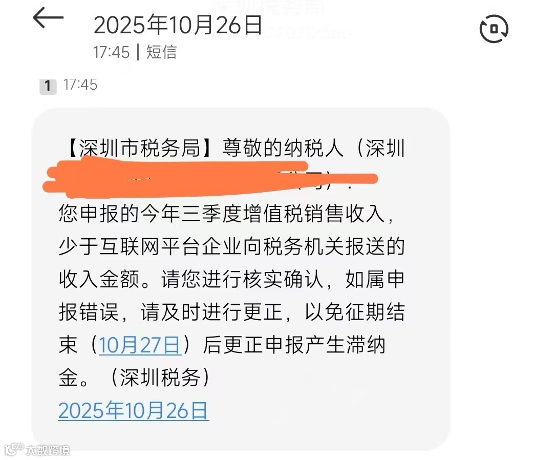 尊敬的纳税人,您申报的今年三季度增值税销售收入,少于互联网平台企业向税务机关报送的收入金额。请您进行核实确认,如属申报错误,请及时进行更正,以免征期结束(10月27日)后更正申报产生滞纳金。