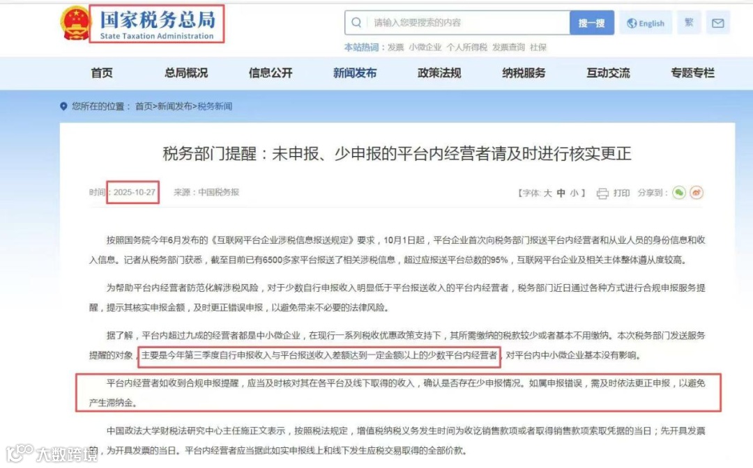 实际上,情况并非如此。有业内人士指出,当卖家自行申报的收入明显低于平台向税务机关报送的金额时,税务部门会发出此类通知,旨在提醒卖家核对数据并自查修正。