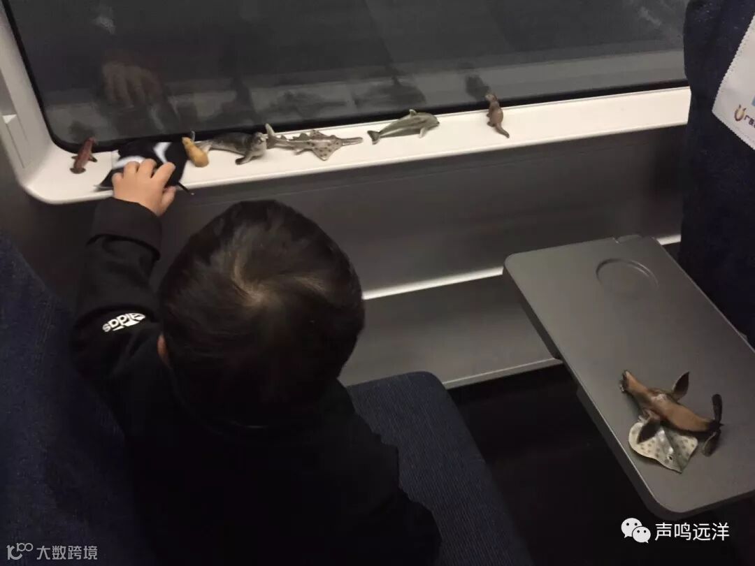 为了打发6个小时的长途车时间,带上动物模型或者与海洋动物、参观海洋馆有关的图片、贴纸、绘本、玩具等(也可在景区或酒店购买,我习惯了提前准备,其实是“qiong”)在火车上和孩子一起玩。6个小时的高铁,儿子精力旺盛,一秒没停。