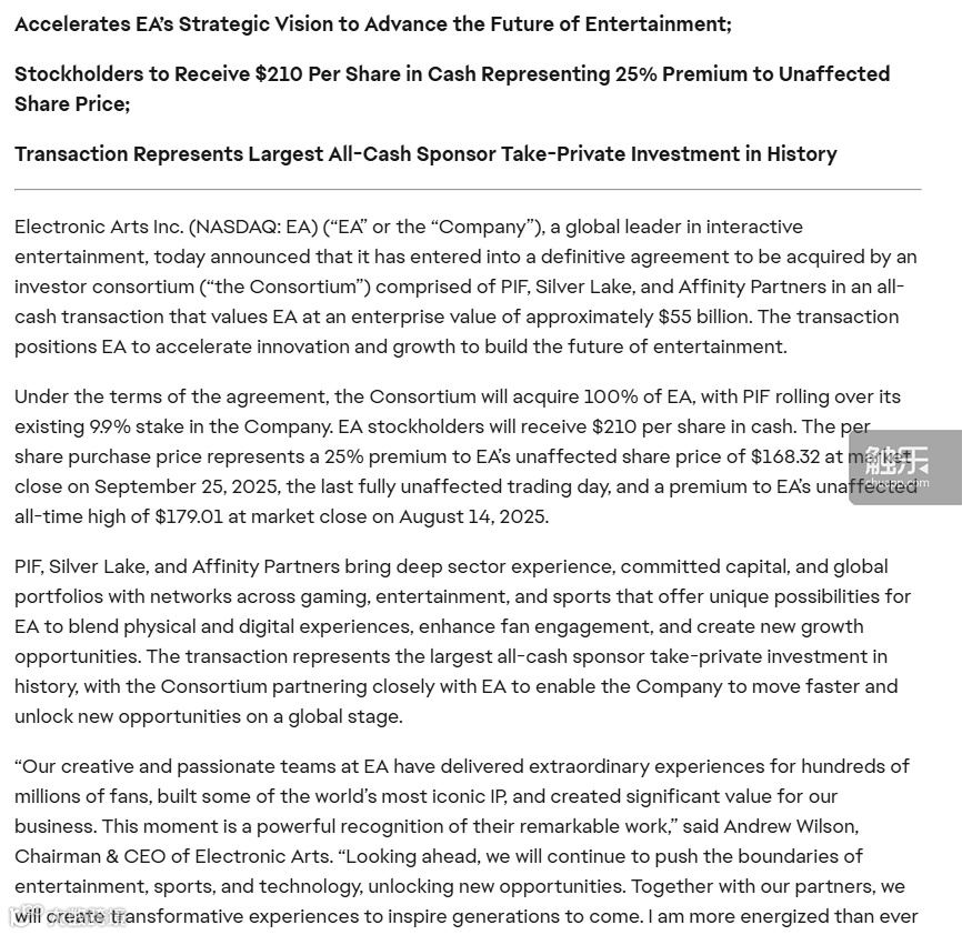 EA预计,这起交易将于下一财年第一季度(2026年6月30日前)完成,收购完成后,EA将退市。公司同时表示,交易完成后,EA总部及公司领导层保持不变,并继续由安德鲁·威尔逊担任首席执行官。
