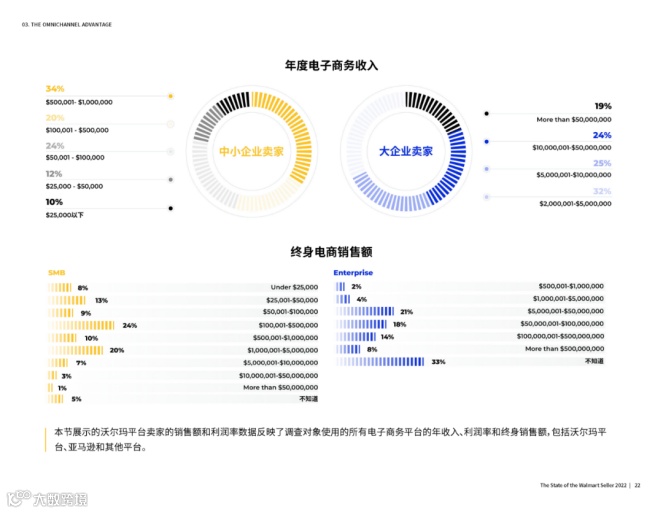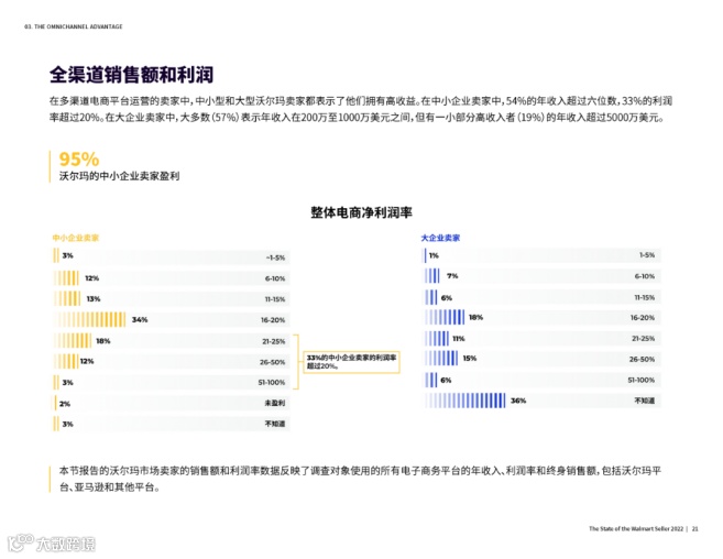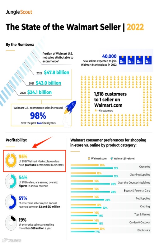 Jungle Scout发布的《沃尔玛2022年度卖家状况报告》显示,在多渠道电商平台运营的卖家中,中小型和大型沃尔玛卖家都实现了高收益,在中小企业卖家中,95%的中小企业卖家都处于盈利状态。