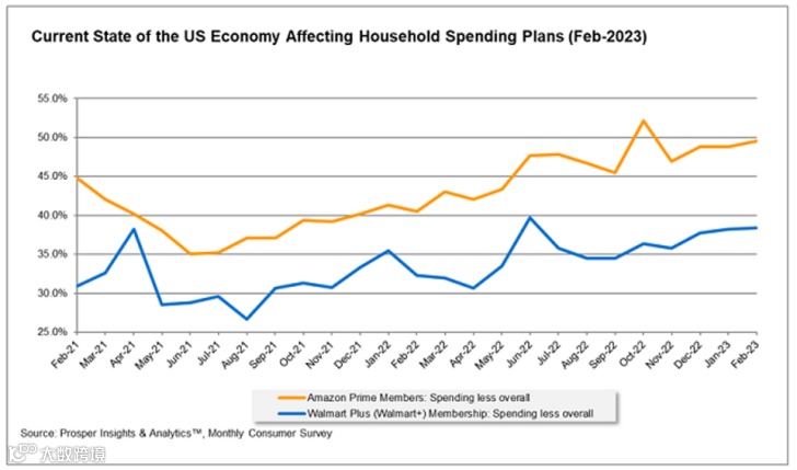 而相较于亚马逊Prime会员计划,Walmart+会员削减消费支出的可能性明显较小,前者比例近50%,后者比例为38%。