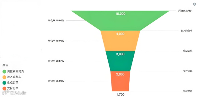 点击转化率(CTR):通常等于点击量 / 曝光量 ×100%,是数字广告核心指标。某品牌信息流优化后,CTR 提升 30%,直观体现素材吸引力与人群定向精准度,反映广告引导用户行动的能力。可以通过消费过程的层层剖析,计算出每个环节的转化率,从下图可以看出一个商品在购物网站上,消费者在浏览到该商品后,到下单购买过程中的每个环节的转化率。