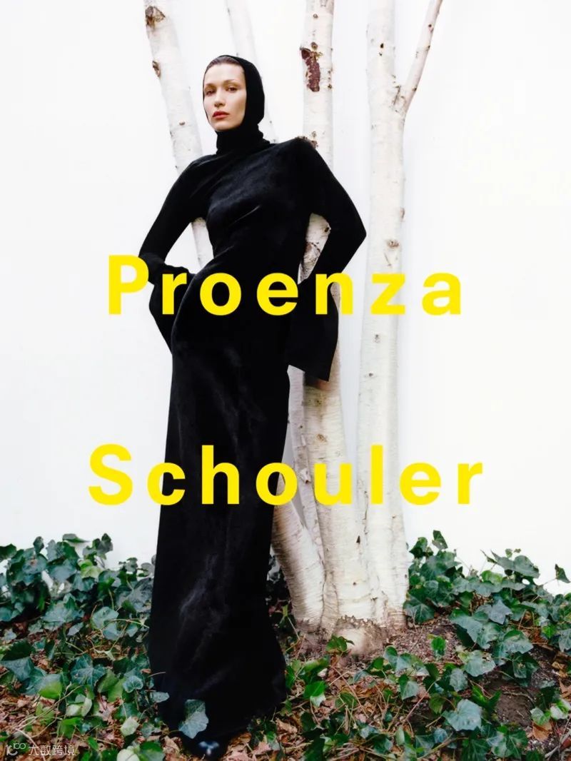 美国品牌 Proenza Schouler为成熟优雅的女性设计服装,他们的 2022 秋季广告大片同样邀请到 Bella Hadid 出境,你能在背景中捕捉到一丝抽象的寒冷,精致的衣服与简单字体则带来了些许北欧风味: