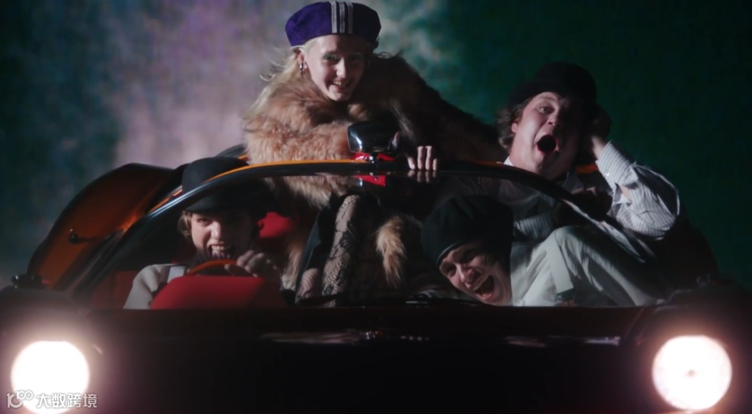 同时一些 Gucci 元素也被巧妙地加入,比如短片开头的《发条橙》场景中,Alex 和他的朋友们正开着一辆偷来的 Durango 95 汽车沿着乡间小路飞驰,原片中的一名坏小子被替换成穿着新系列服装的模特: