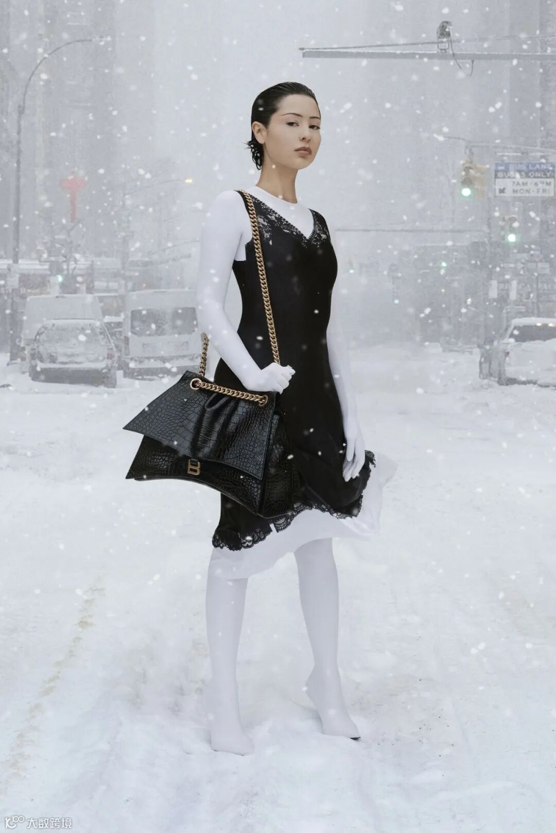 Demna 主导了 Balenciaga 22 秋冬时装秀,布置出狂风吹起雪花的圆形秀场,模特们戴上墨镜和高跟鞋在雪中艰难行走。