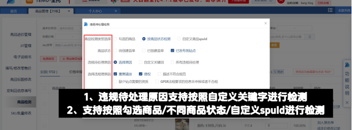 (2)点击违规待处理按钮检测店铺中有多少商品Temu平台提示了违规。支持自定义选择检测项,检测后支持导出结果
