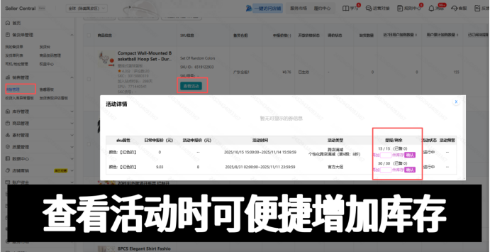 5、Temu卖家中心-销售管理模块:sku商品信息中置入的查看活动按钮,点击”查看活动"弹出的窗口中新增增加库存操作,查看活动时即可快速添加库存