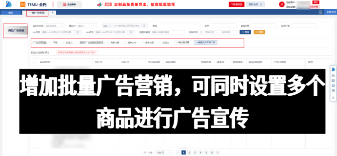 3、广告营销模块-一键广告投放:广告营销新增一键广告投放,支持按照成本、skc/sku货号、标题进行筛选查询,可同时设置多个商品进行广告宣传