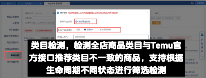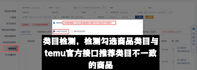 (1)点击类目检测按钮,检测当前店铺商品类目是否有错误的与Temu官方接口推荐类目不一致的商品