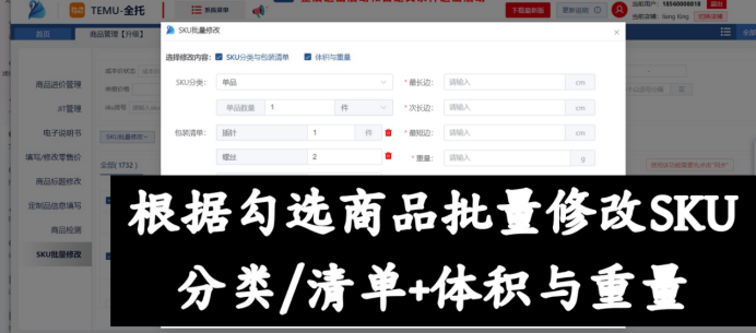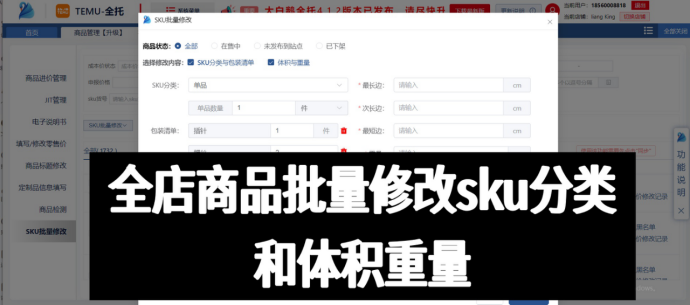 2、商品管理【升级】模块-SKU批量修改:商品管理新增sku批量修改模块,支持全店或勾选指定商品批量修改sku分类和体积重量