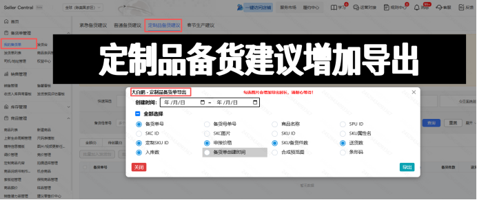 4、Temu卖家中心-我的备货单-定制品备货建议:我的备货单定制品备货建议增加批量导出按钮,可导出定制品备货单基本信息、合成效果图、SKC图片、定制品条形码等信息