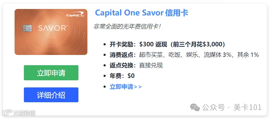 无年费,新版Savor卡在流媒体消费享3%返现。官网仅明确列出Netflix、Hulu、Disney+,其他平台是否涵盖尚不清晰。明确排除Amazon Prime Video、DirecTV Stream、Verizon FIOS点播、有声书订阅及健身类内容[k]。