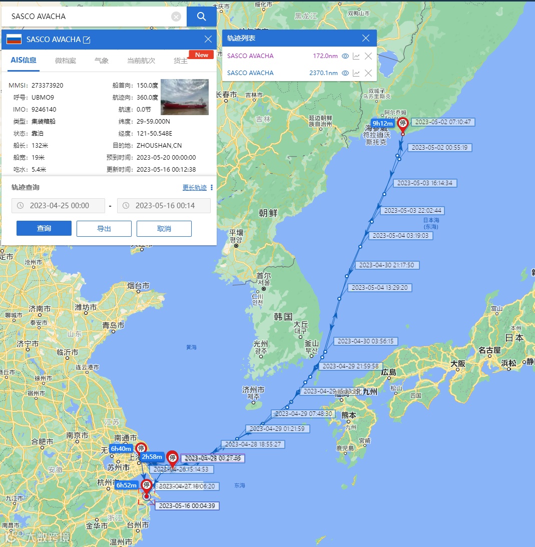船舶从中国东南沿海港口到符拉迪沃斯托克港(海参崴港)的航行轨迹(图/船讯网)