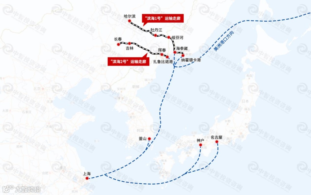 长春—吉林—珲春—克拉斯基诺(珲春—马哈力诺、珲春—卡梅绍娃娅)—扎鲁比诺港—海上航线;主要针对吉林省。