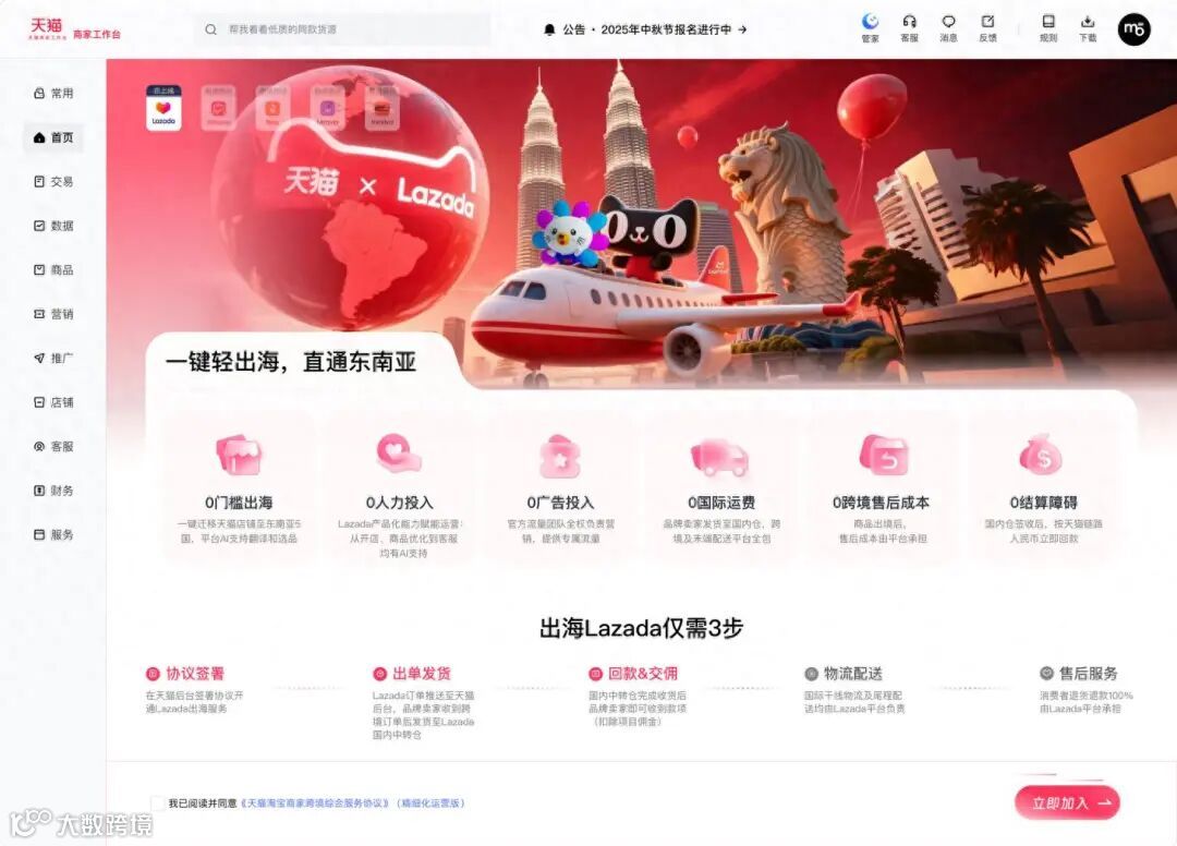 据项目内部人士介绍,这是天猫和Lazada首次进行系统级打通。加入项目协议的商家可以马上拥有一间和天猫一样的LazMall店铺迎接东南亚消费者,商品信息经AI翻译后同步上架。整个过程中,商家无需重新注册、无需组建本地团队、无需复杂运营;商家仅需供货至国内中转仓,后续的多语言客服、广告投入、国际运费均由Lazada负责,商品出境后的跨境退货成本,也将由平台全额兜底。
