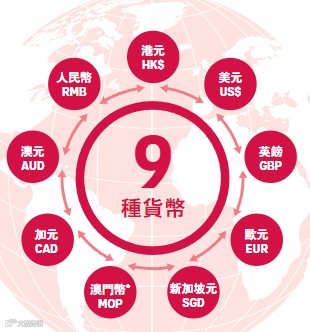 首年保单支持美元/港币和澳门币,第2个保单周年起支持转化货币,高达9种币种。