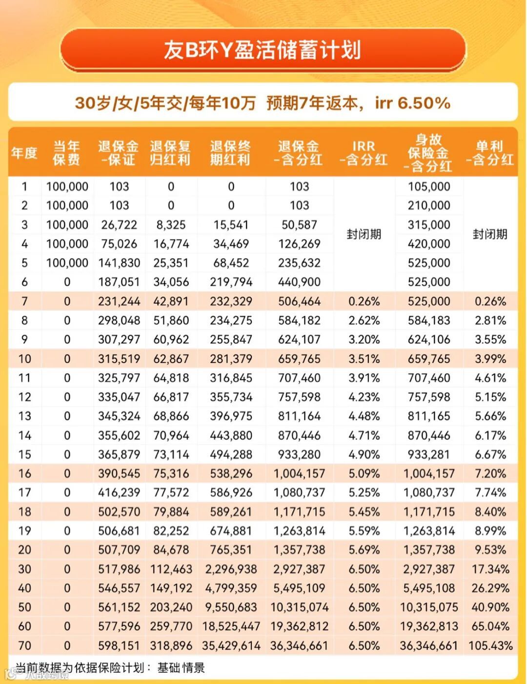 • 保单第 7 年,退保金(含分红)达 50.6 万 ,实现 “回血”,之后有急用钱需求,可以灵活提领; -