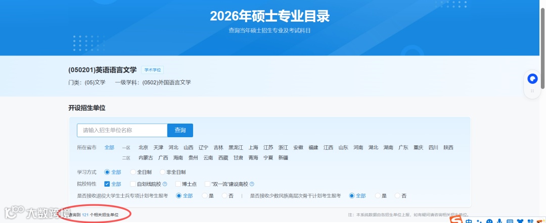 根据2026年最新的研招网专业目录显示,以“英语语言文学(050201)”名称招生的高校一共有121所(2025年有127所),